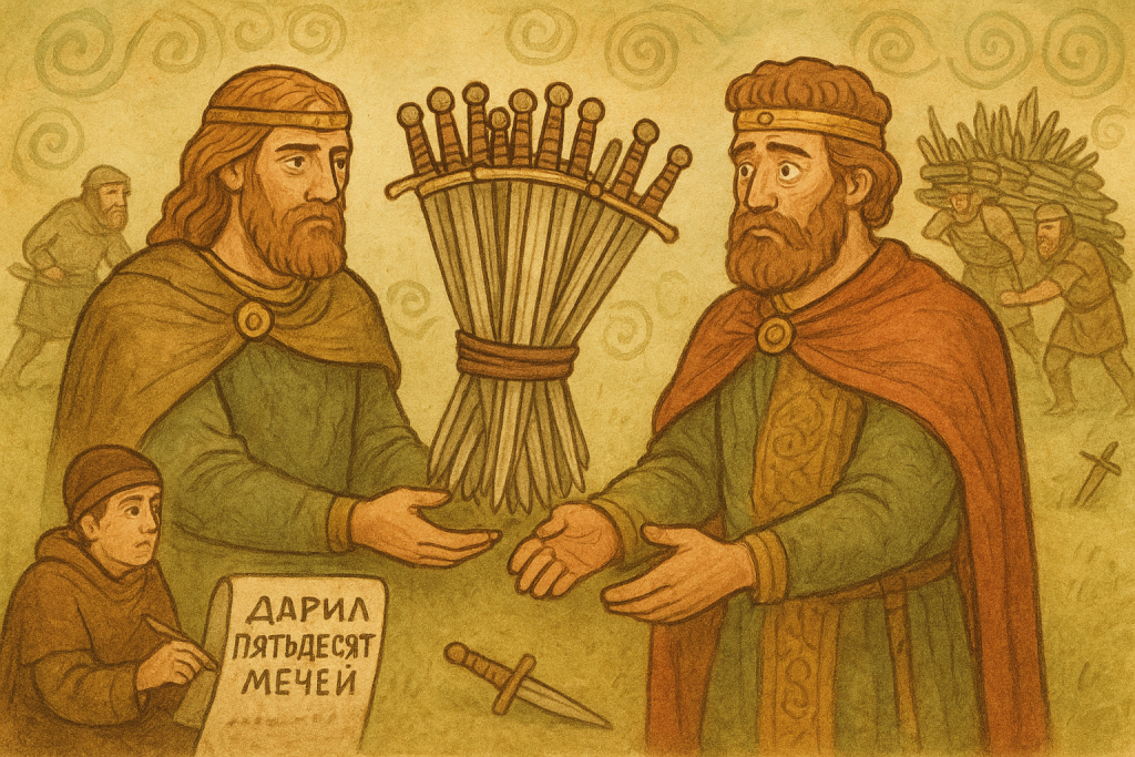 Или вот вернёмся к подаркам вождей. Для того времени поистине королевский подарок это… уздечка, богато украшенная. Или копьё с железным наконечником. Или, роскошь какая, меч. Может быть кубок или чаша. Но скорее всего корова, свинья, конь. Качественные и нужные в быту подарки. Описания примерно таких подарков мы в мифологии и видим, довольно правдоподобные, но там они, почему-то, умножены на n.