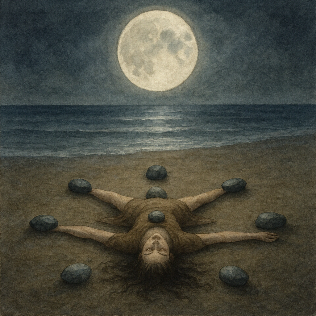 Он детально описал ритуал, в котором ведьмы посвящали себя Тьме. Сначала ведьма должна была дождаться полнолуния. В полночь она должна была прийти на пустынный пляж, трижды повернуться противосолонь и лечь на песок, оголившийся во время отлива. Затем она должна вытянуть руки и ноги, положить рядом с ними камни, и еще три камня на голову, сердце и грудь.